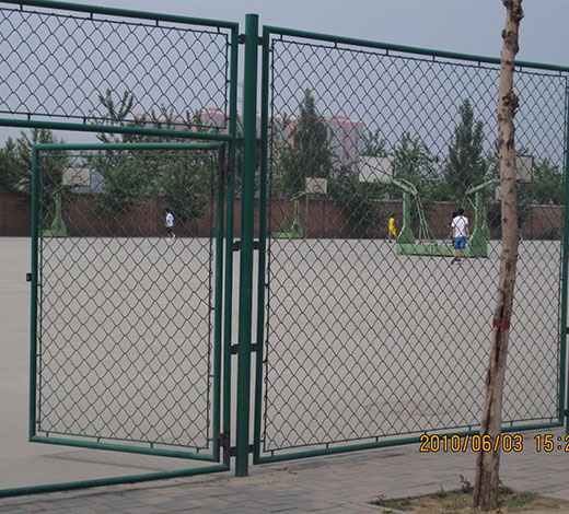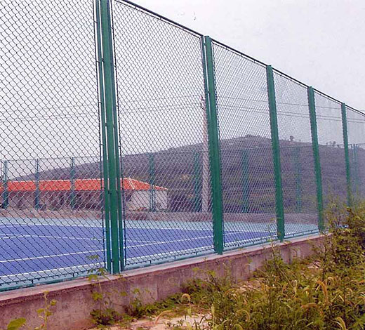 采用φ3.8鍍鋅線包塑網(wǎng),網(wǎng)孔規(guī)格45MM×45MM,網(wǎng)高4 M,立柱用φ75鋼管,橫柱用φ60鋼管刷二遍防銹專用底漆,二遍墨綠色面漆,包塑網(wǎng)用包塑扁鐵壓緊,用鍍鉻螺絲固定于網(wǎng)架上,做一扇1200×2000MM單門。在基礎(chǔ)施工時,按照預(yù)埋件施工示意圖所標(biāo)明的尺寸,要先預(yù)埋好預(yù)埋件。挖500*500的地槽,燈柱預(yù)埋件的尺寸為300*300mm,圍網(wǎng)預(yù)埋件的尺寸為 250*250mm。每個預(yù)埋件用4個12mm的鋼筋焊接固定,鋼筋的長度為400mm。鋼筋在端部彎起。 圍網(wǎng)由包塑網(wǎng)、立柱、橫桿以及連接構(gòu)件組成。網(wǎng)高4米,所以在圍網(wǎng)中間設(shè)立一跟橫桿,用φ75鋼管,主要增強圍網(wǎng)的受力。圍網(wǎng)立桿的間距由球場四周范圍的尺寸決定,一般間距不超過3.8米。也不能太小,否則增加成本。
